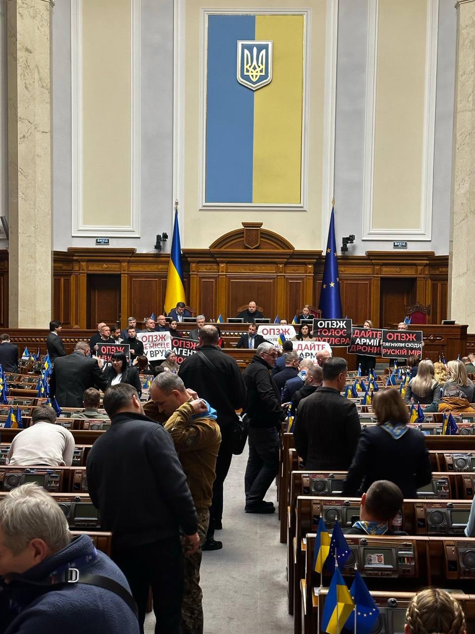 Между тем в Верховной Раде депутаты от партии Петра Порошенко "Европейская солидарность" и "Голоса" вышли с плакатами к трибуне с требованием лишить мандатов членов депутатской группы "Платформа за жизнь и мир". А затем этот вопрос рассматривали на Согласительном совете. Нардепы предлагали принять отдельный законопроект, который откроет путь к лишению депутатов мандатов, но голосование провалилось.