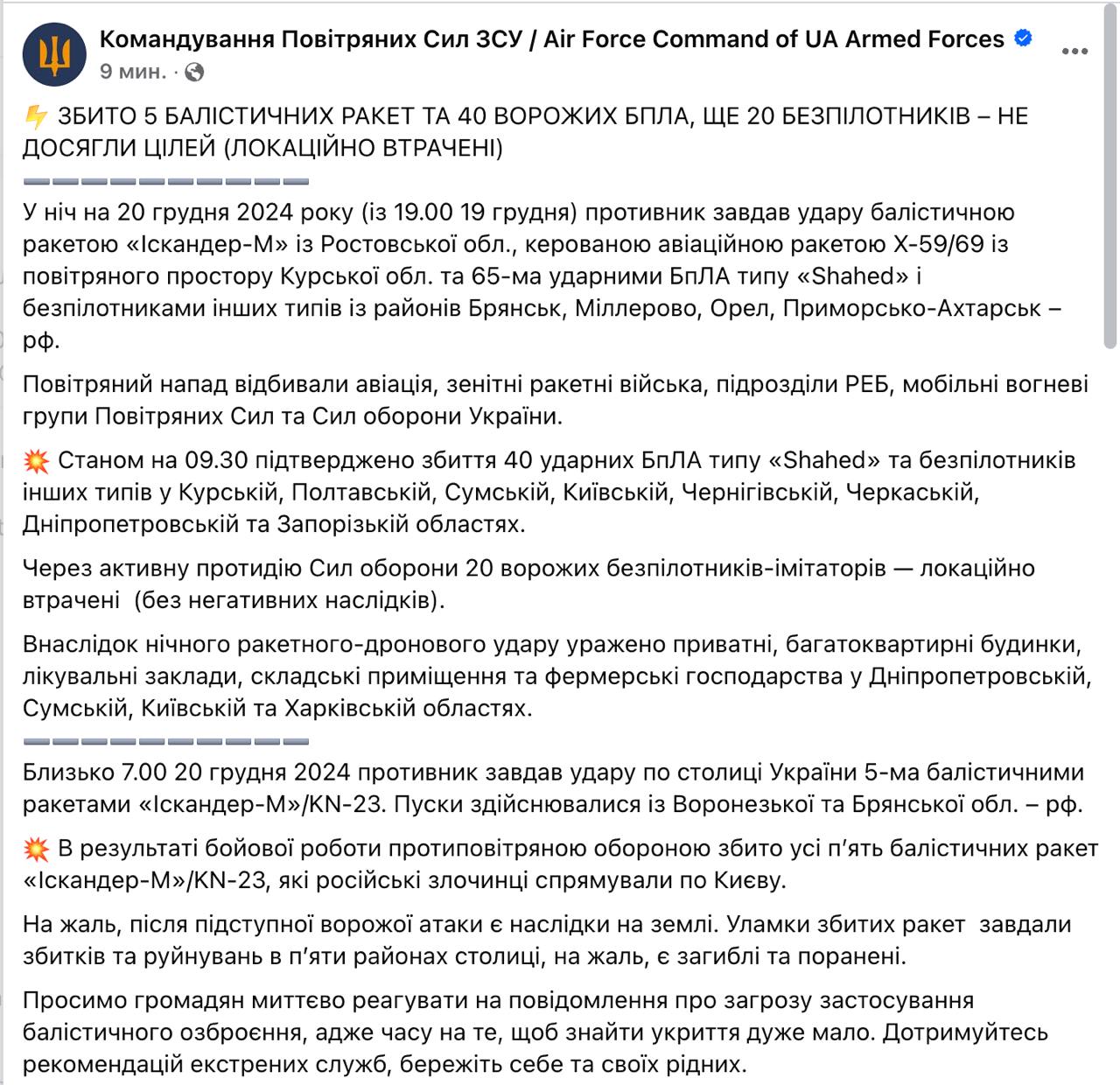 Также пишут о сбитии 40 "Шахедов" из 65. Ещё 20 "локационно утрачены".