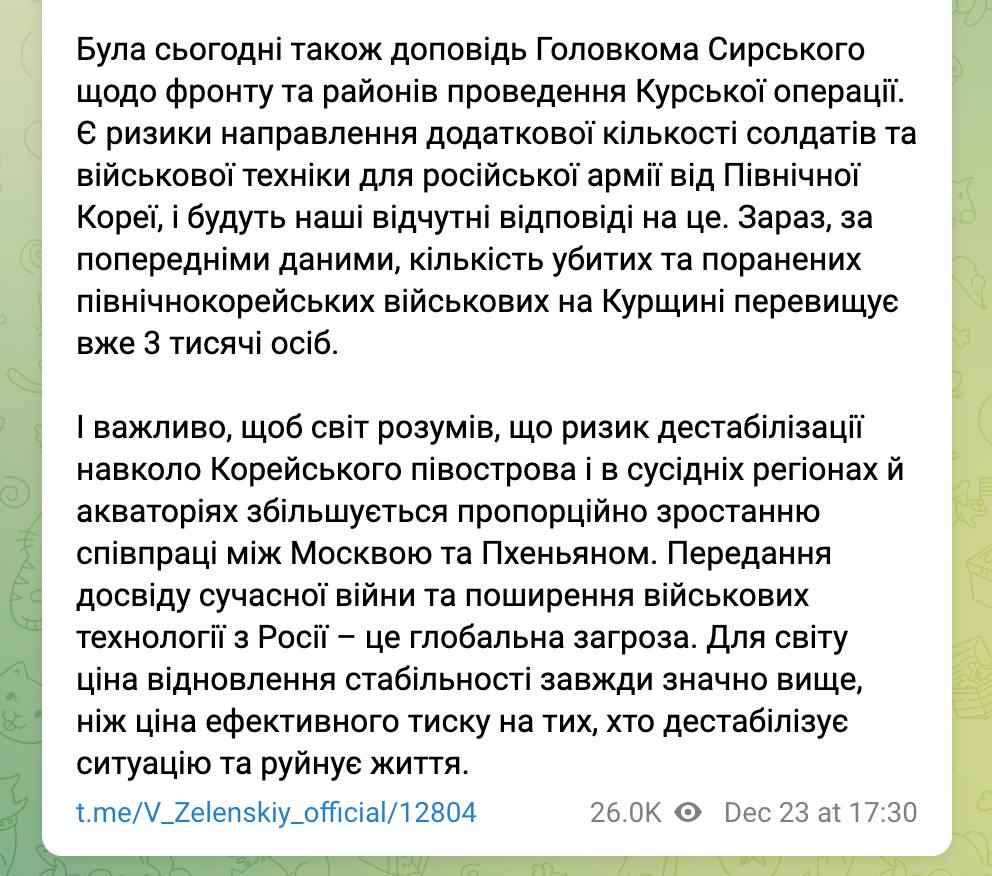 Он утверждает, что в Курской области уже были убиты и ранены более 3000 северокорейских военных.