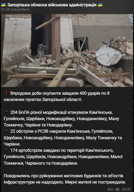08:07 За прошедшие сутки россияне нанесли 400 ударов по 8 населенным пунктам Запорожской области, сообщает глава ОВА Иван Федоров.