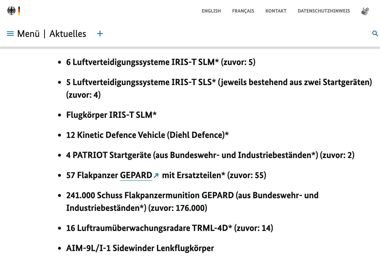 Также в новый пакет военной помощи ФРГ вошли 15 танков Leopard 1 A5, две зенитные самоходные установки Gepard с боеприпасами, 30 броневиков MRAP, самоходная гаубица PzH 2000, 12 броневиков с системами кинетической обороны, два радара TRML-4D, управляемые ракеты AIM-9L/I-1 Sidewinde, 52 тысячи снарядов 155-мм и другое оружие.