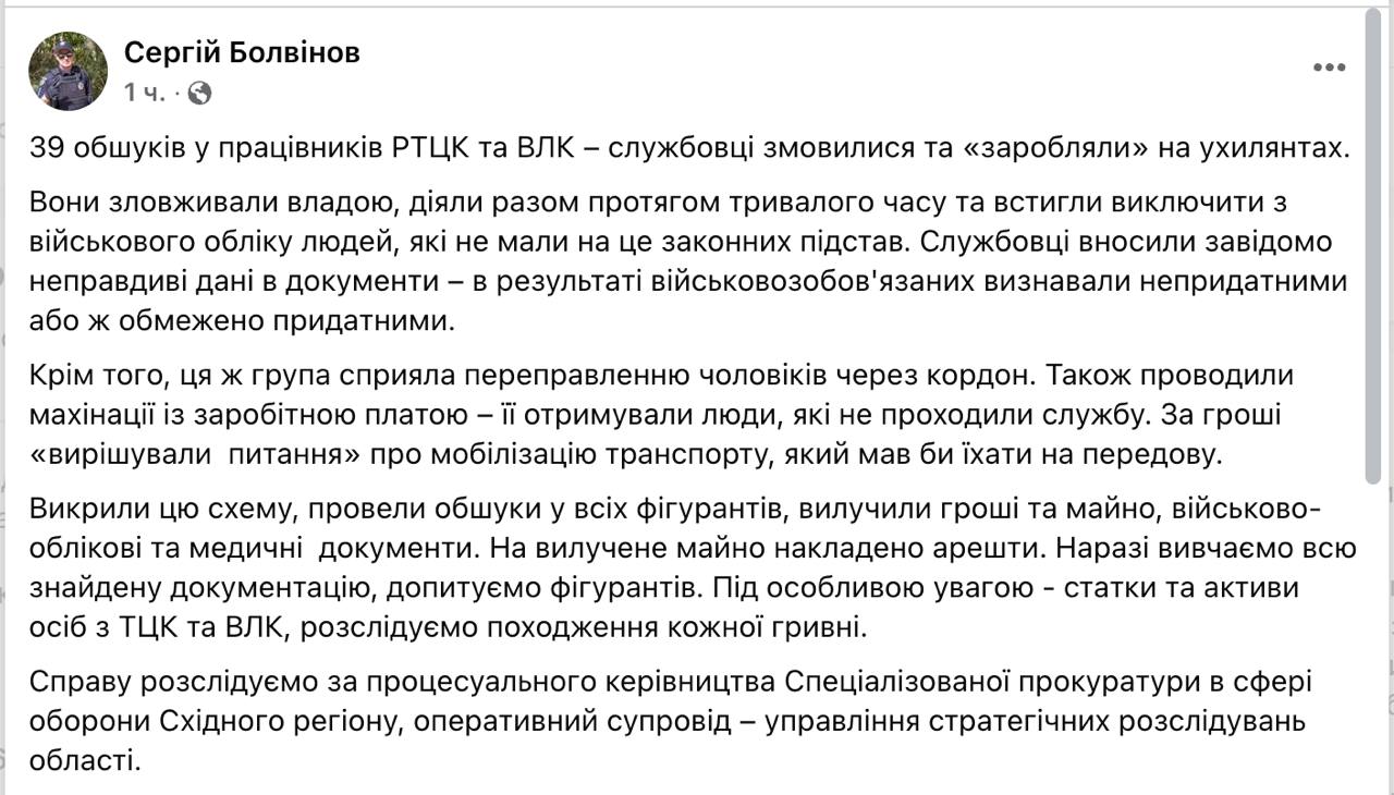 В Харьковской области проходит сразу 39 обысков у работников ТЦК и СП и военных медкомиссий, которые зарабатывали деньги на схемах уклонения от мобилизации.