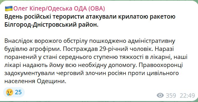 22.55 В результате ракетного удара по Белгород-Днестровскому району повреждено административное здание агрофирмы.