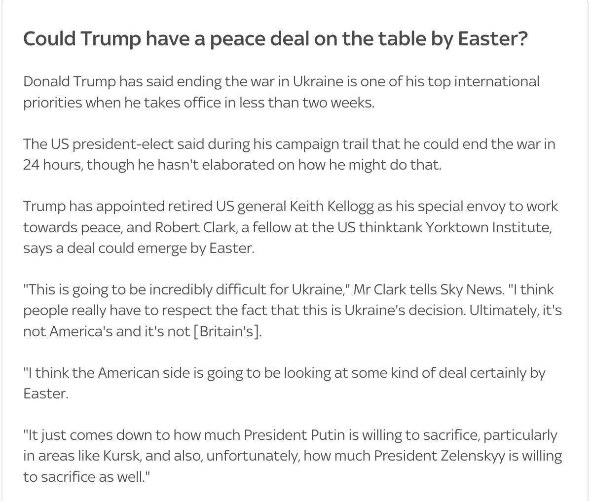 "Это будет невероятно сложно для Украины. Я думаю, что американская сторона будет стремиться к заключению какой-либо сделки, безусловно, к Пасхе. Все сводится к тому, насколько президент Путин готов к уступкам, особенно в таких областях, как Курск, а также, к сожалению, насколько президент Зеленский готов к уступкам", - заявил Кларк.