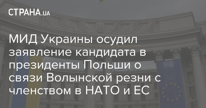 МИД Украины назвал манипулятивными заявления председателя Института национальной памяти Польши и кандидата в президенты Кароля Навроцкого о том, что вопросы членства Украины в ЕС и НАТО зависят от признания Киевом ответственности за Волынскую резню.
