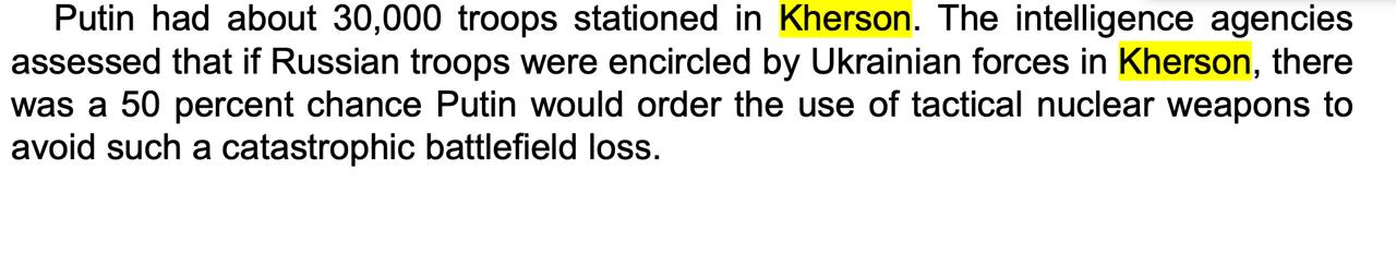 "Путин разместил в Херсоне около 30 000 военнослужащих. По оценкам разведывательных служб, если бы российские войска были окружены украинскими войсками, вероятность того, что Путин отдаст приказ о применении тактического ядерного оружия, чтобы избежать столь катастрофических потерь на поле боя, составляла 50 процентов", - пишет Вудворд.