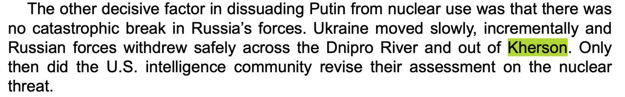 Но, исходя из повествования Вудворда, можно сделать предположение, что американцы, опасаясь применения ядерного оружия со стороны Путина, повлияли на украинское военно-политическое руководство, чтобы ВСУ дали россиянам возможность спокойно уйти из Херсона.