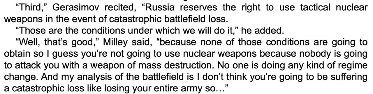 После этого Байден, по информации Вудворда, приказал на всех уровнях связаться с Россией и сделать все, чтобы не допустить ядерного сценария. Далее состоялся разговор между главами генштабов США и РФ Милли и Герасимовым. Герасимов заявил, что ЯО может быть применено в случае катастрофических потерь российских войск (что подходило под назревающие проблемы в Херсоне). На что Милли заверил, что такого поражения у России не будет.