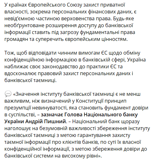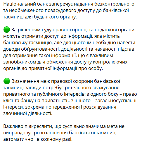 "Значение института банковской тайны не менее важно, чем определенный в Конституции принцип презумпции невиновности, которая составляет фундамент доверия в обществе. Национальный банк каждый раз отмечает безусловную важность сохранения института банковской тайны с целью гарантирования защиты тайной информации о клиентах банков, по сути их собственной конфиденциальной информации, с целью сохранения доверия к банковской системе на высоком уровне", – приводится заявление председателя НБУ Андрея Пышного.