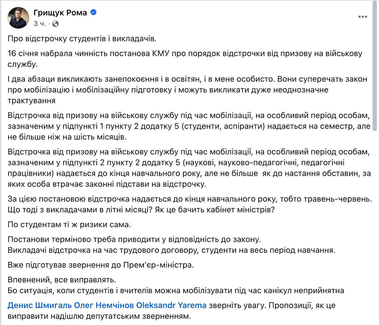 "По этому постановлению отсрочка предоставляется до конца учебного года, то есть май-июнь. Что тогда с преподавателями в летние месяцы? По студентам те же риски", - написал Грищук.
