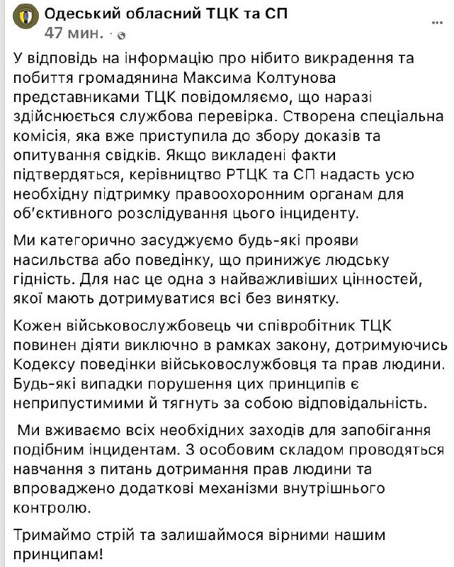 "Моего сына схватило ТЦК, вывезли за город и хотя у него все документы о том, что я, его мать и его жена инвалиды 2-й группы, били около трех часов, вымогая деньги, а потом выбросили на дорогу без сознания, решив что он умер. Люди вызвали скорую помощь. У него отломаны три ребра, проколото лёгкое ребром, кровоизлияние в легкое, ушиб селезенки и сотрясение мозга. Сделали одну операцию на легком, неудачно, в понедельник будут переделывать. Я в стрессе. Ничего не соображаю", - написала Колтунова.