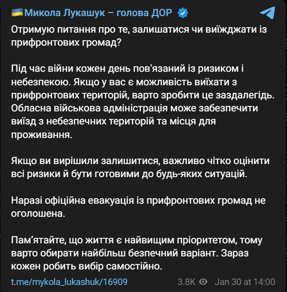 "Если у вас есть возможность уехать из прифронтовых территорий, следует сделать это заранее. Пока официальная эвакуация из прифронтовых общин не объявлена", - написал Лукашук.