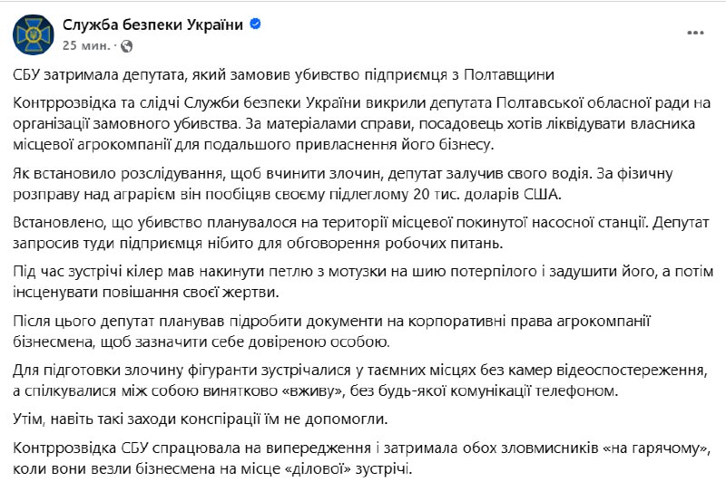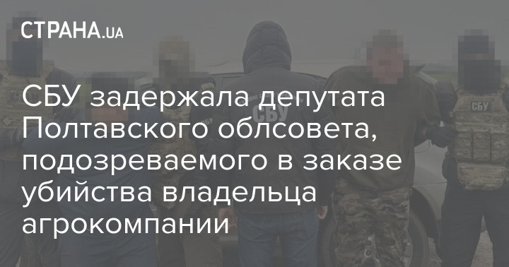 Служба безопасности Украины задержала депутата Полтавского областного совета, подозреваемого в заказе убийства владельца местной агрокомпании для завладения его бизнесом.