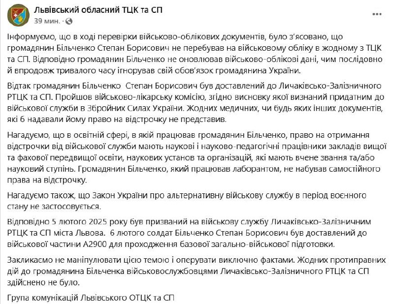 "6 февраля солдат Бильченко Степан Борисович был доставлен в воинскую часть А2900 для прохождения базовой военной подготовки. Никаких противоправных действий к гражданину Бильченко военнослужащими Лычаковско-Железнодорожного РТЦК и СП совершено не было", - говорится в сообщении.
