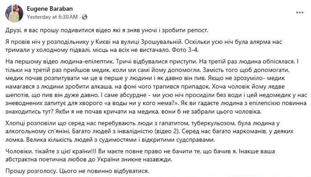 Члены военно-врачебной комиссии объявили ему, что делают своё заключение на основании электронной базы eHealth, где не оказалось никаких данных о перенесении ранее Барабаном операций и наличии дефектов сердца. После чего Евгения "запихали в бус" и увезли из Соломенского ТЦК на распределительный пункт по улице Оросительная (вызов полиции не помог, так как наряд просто не пустили в ТЦК).