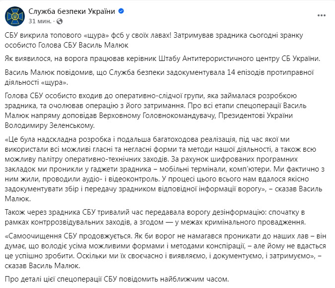 Малюк рассказал, что Служба безопасности задокументировала 14 эпизодов противоправной деятельности сотрудника. Глава СБУ входил в оперативно-следственную группу, которая занималась разработкой мужчины, и возглавлял операцию по его задержанию. Обо всех этапах спецоперации Малюк напрямую докладывал Владимиру Зеленскому.