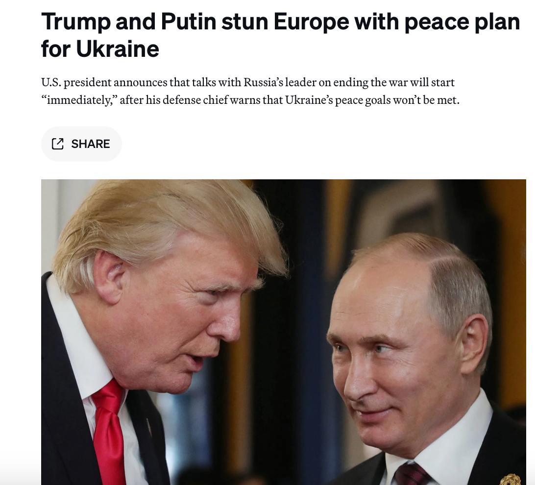 "Внезапность и масштабы мирного плана Дональда Трампа ввергли союзников Украины в шок", - пишет газета Politico. По ее мнению, Трамп и Путин "ошеломили" Европу своим разговором.