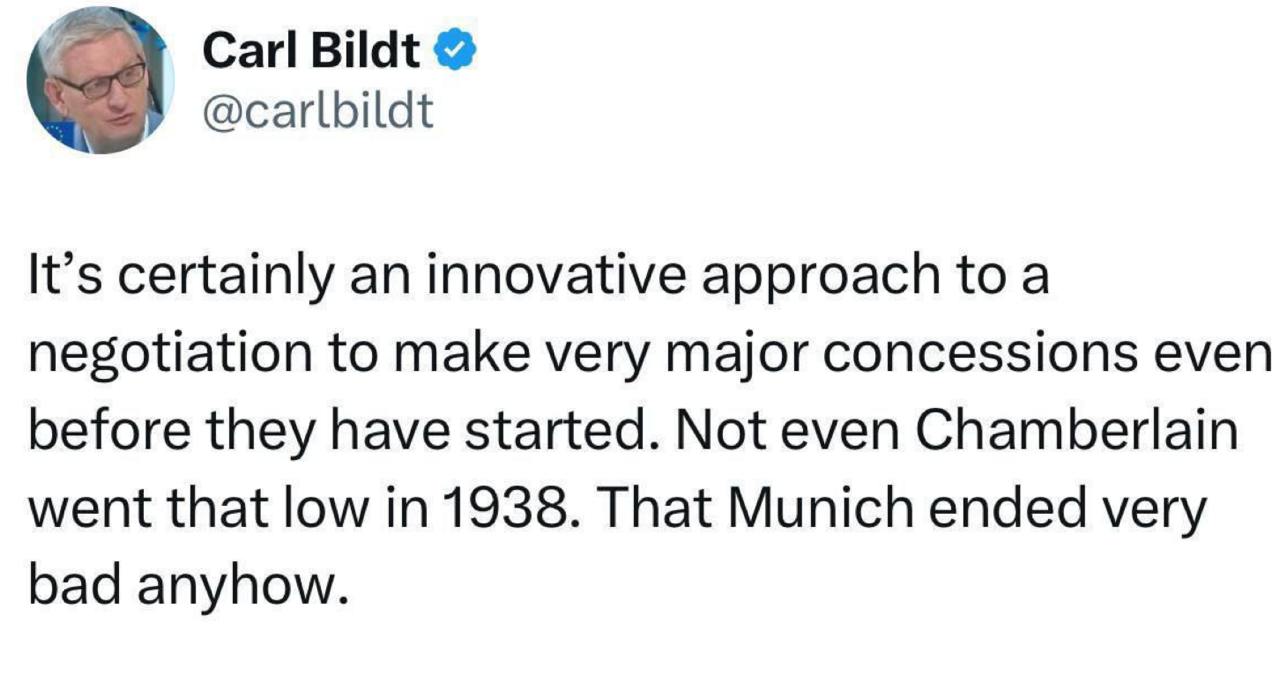 Бывший премьер Швеции Карл Бильдт сравнил действия Трампа и Хегсета с "Мюнхенским сговором", заявив, что "даже Чемберлен в 1938 году не опускался так низко".