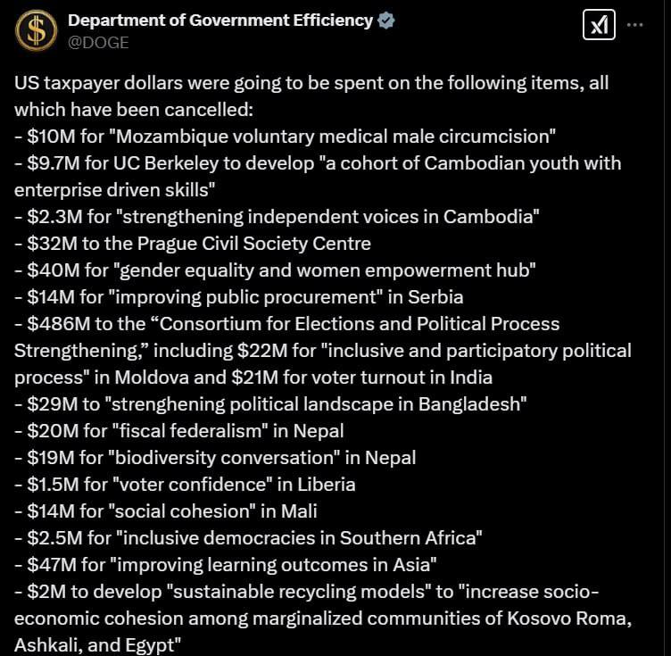 Департамент эффективности государственного управления (DOGE), возглавляемый Илоном Маском, опубликовал перечень расходов США, которые были им отменены.