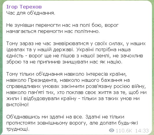 Мэр Харькова Игорь Терехов высказался в аналогичном духе, опубликовав пост о "времени для объединения". По его словам, враг пытается победить политически, не одолев Украину на фронте.