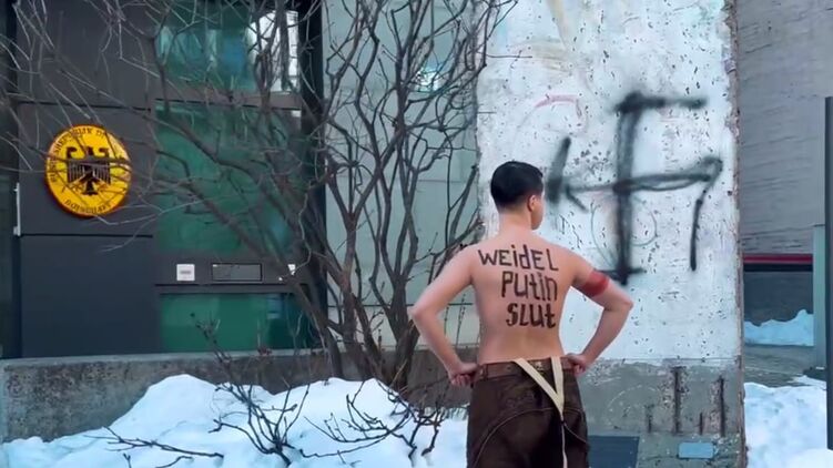 На ее теле также была нацистская символика и слоган "Хайль Вайдель" (Алиса Вайдель - глава "АдГ"). Она выкрикивала "Вайдель - шлюха Путина" и зиговала.