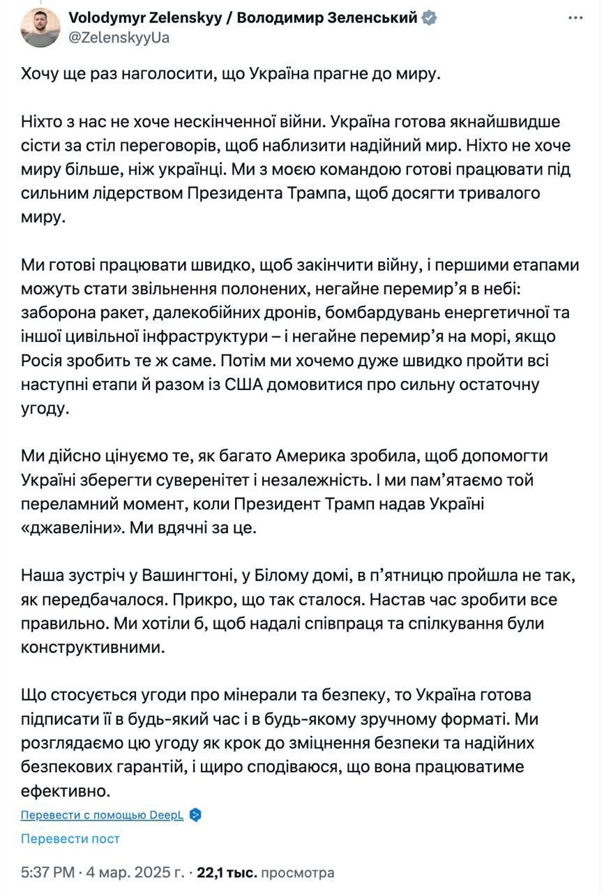 Владимир Зеленский написал пост о своей перепалке с президентом США Дональдом Трампом в Белом доме, в котором так и не принёс извинений американскому лидеру. Он лишь выразил сожаление по поводу случившегося.