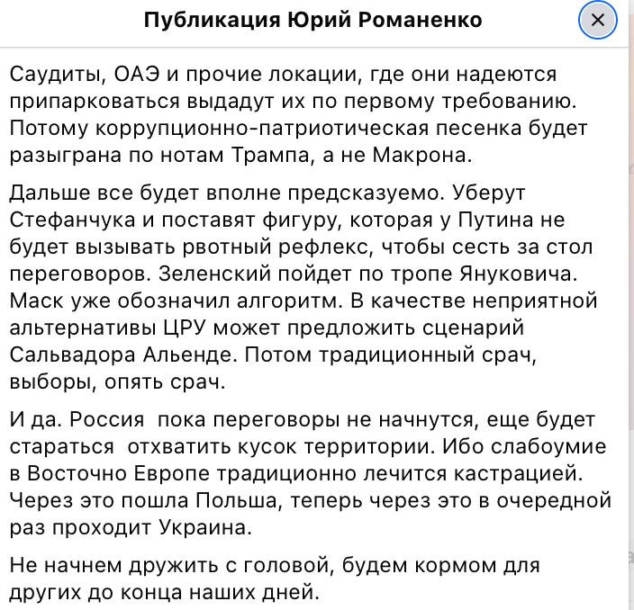 "Дальше все будет вполне предсказуемо. Уберут Стефанчука и поставят фигуру, которая у Путина не будет вызывать рвотный рефлекс, чтобы сесть за стол переговоров. Зеленский пойдет по тропе Януковича. Маск уже обозначил алгоритм. В качестве неприятной альтернативы ЦРУ может предложить сценарий Сальвадора Альенде", - считает Романенко.