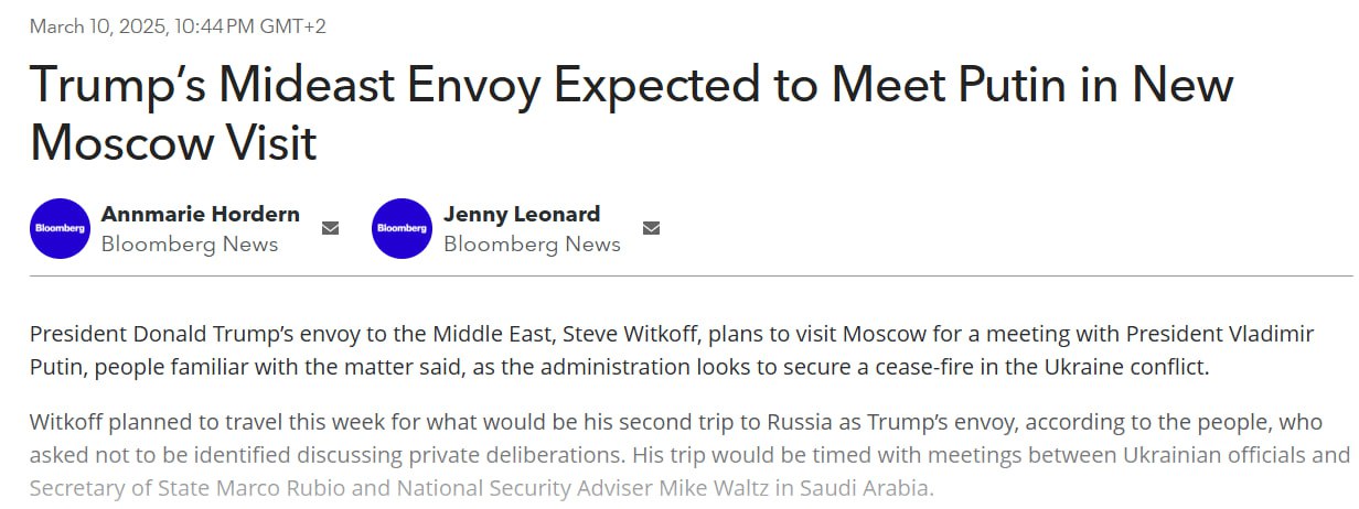 Напомним, что Уиткофф уже встречался с Путиным в Москве в феврале, когда обсуждал обмен заключенными.