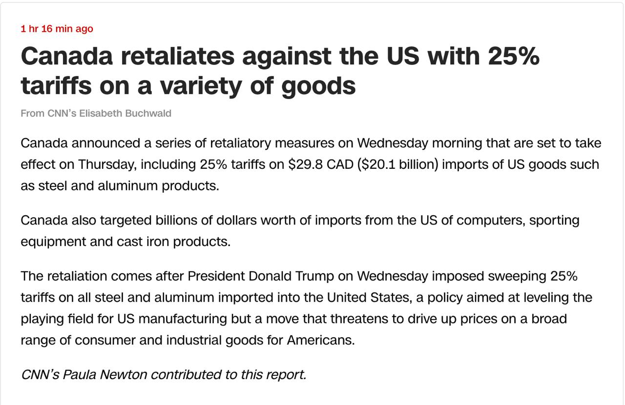 Канадские власти решили ввести пошлины в размере 25% на импорт некоторых американских товаров в ответ на введенные президентом США Дональдом Трампом 25%-ные пошлины на сталь и алюминий из Канады.