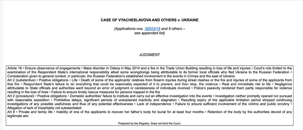Суд пришел к выводу, что одесская полиция "не сделала практически ничего", чтобы предотвратить нападение на митингующих, проигнорировала многочисленные оперативные данные о подготовке беспорядков, "отправка пожарных машин на место пожара была намеренно задержана на 40 минут, а полиция не вмешалась, чтобы помочь эвакуировать людей" из Дома профсоюзов.