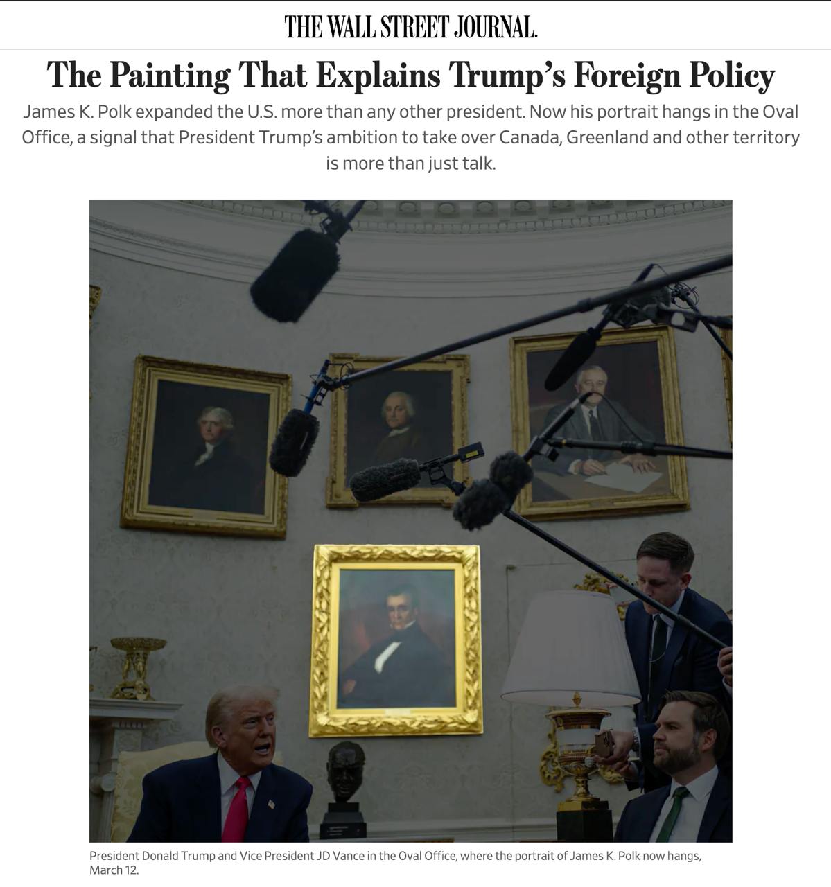 Издание отмечает, что после возвращения в Белый дом он повесил в Овальном кабинете портерт Джеймса Полка - 11-го президента США, которым восхищается из-за "получения большого количества земель". Полк за четыре года почти удвоил территорию США, аннексировал Техас, а также вынудил Мексику продать Калифорнию, Аризону, Нью-Мексико, Неваду, Юту и части Колорадо и Вайоминга.