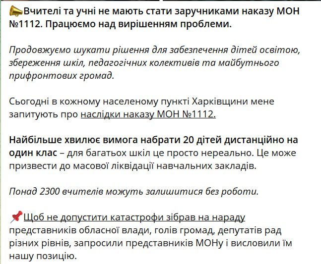 По его словам, 2300 учителей (в частности, в Харьковской области) останутся без работы из-за того, что в МОН приказали набрать минимум 20 детей дистанционно на один класс с 1 сентября 2025 года. Приказ нереален и может привести к ситуации, когда тысячам эвакуированных детей некуда будет вернуться – в родных населенных пунктах не останется школ.