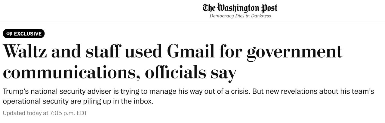 Один из помощников Уолтца вел переписки через Gmail с коллегами из других правительственных ведомств. Письма касались чувствительных военных вопросов, событий в Йемене и систем вооружения. На почту Gmail советника Трампа отправляли менее конфиденциальную информацию, например, его расписание и другие рабочие документы. По словам источников газеты, иногда Уолтц копировал и вставлял фрагменты своего расписания в Signal, чтобы координировать встречи и обсуждения.