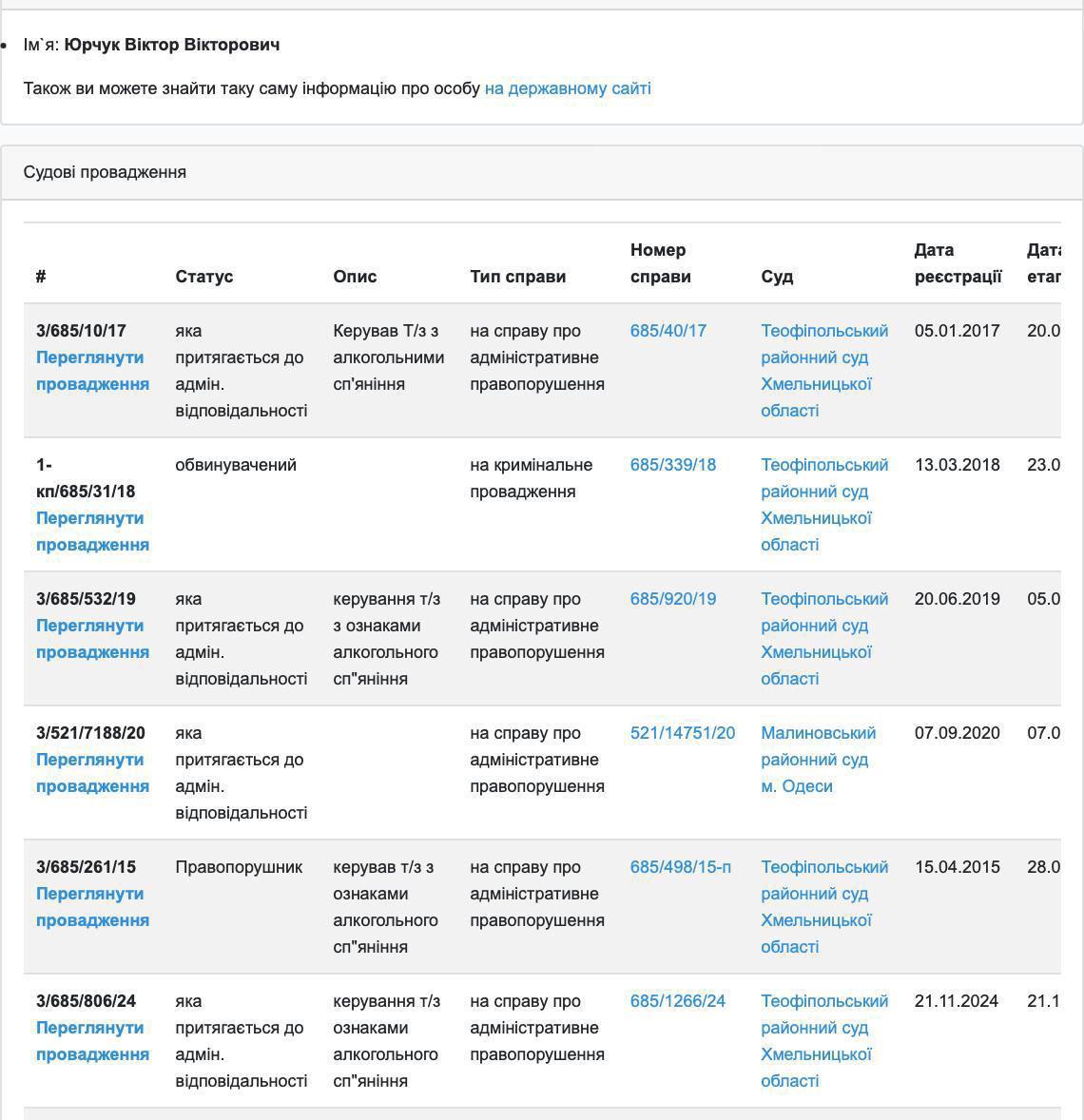 После этого заявления телеграм-каналы нашли в судебном реестре семь разбирательств в отношении Юрчука за езду за рулем в состоянии алкогольного опьянения. Первое дело было зарегистрировано еще в 2015 году, а последнее - в январе этого года.