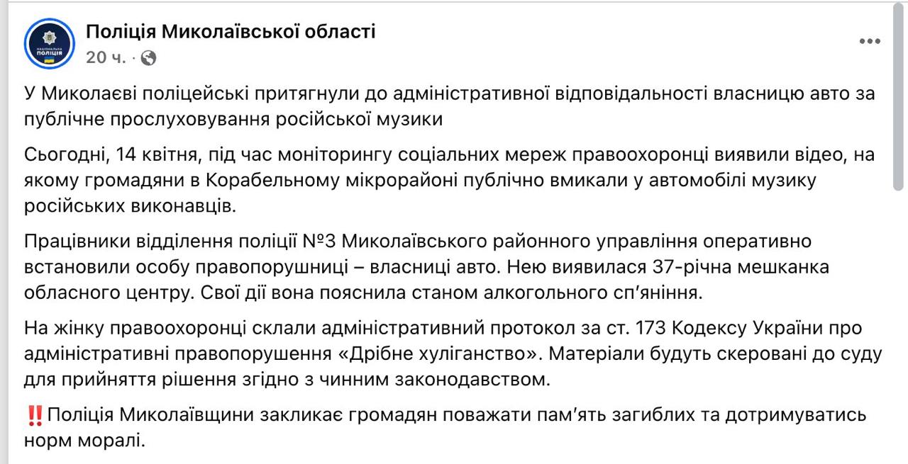 Полиция обвинила в хулиганстве гражданку за музыку на русском языке. Фото: facebook.com/UA.National.Police.Nikolaev
