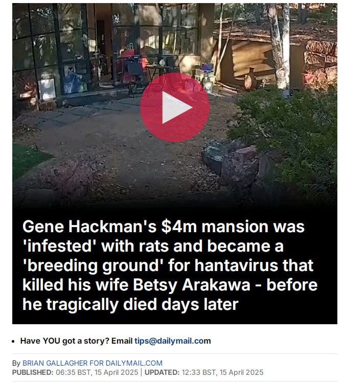 Усадьба умершего при невыясненных обстоятельствах 95-летнего голливудского актера Джина Хэкмена стоимостью 4 миллиона долларов была наводнена крысами, что стало причиной появления опасного хантавируса, который и привел к смерти его 63-летней жены Бетси Аракаву. Затем он сам скончался несколько дней спустя.