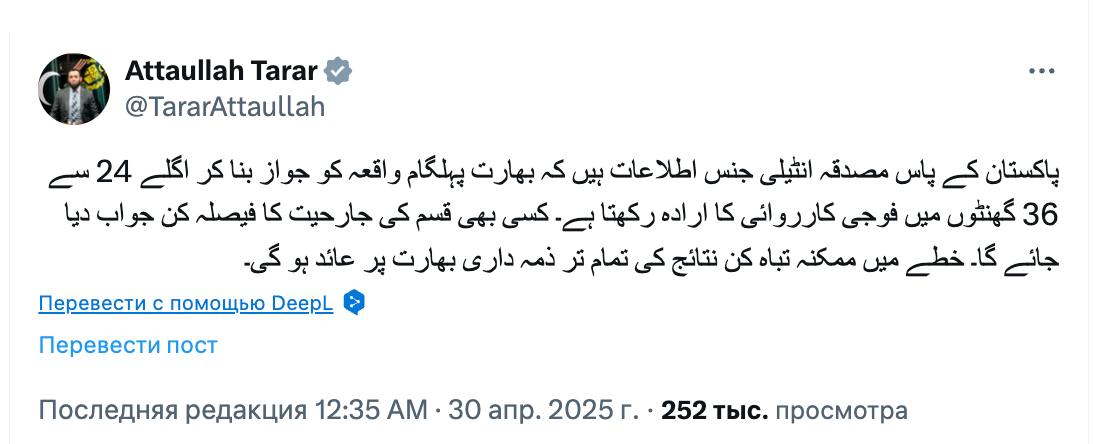 "Индия, использовав инцидент в Пулваме как предлог, планирует провести военную операцию в течение следующих 24–36 часов. Пакистан оставляет за собой право на любой вид ответных действий. Вся ответственность за возможные разрушительные последствия полностью ложится на Индию", - написал Тарар.