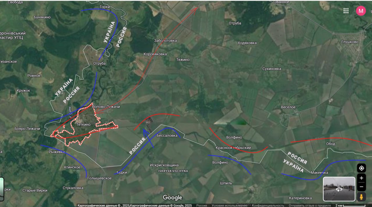 Теткино находится в довольно неудобном для обороны россиянами положении - фактически на выступе, который с трех сторон окружает украинская территория. Судя по всему именно поэтому данный район и выбрали ВСУ для удара.