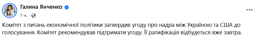 "Комитет по вопросам экономической политики утвердил соглашение о недрах между Украиной и США к голосованию. Комитет рекомендовал поддержать соглашение", - написала Янченко.