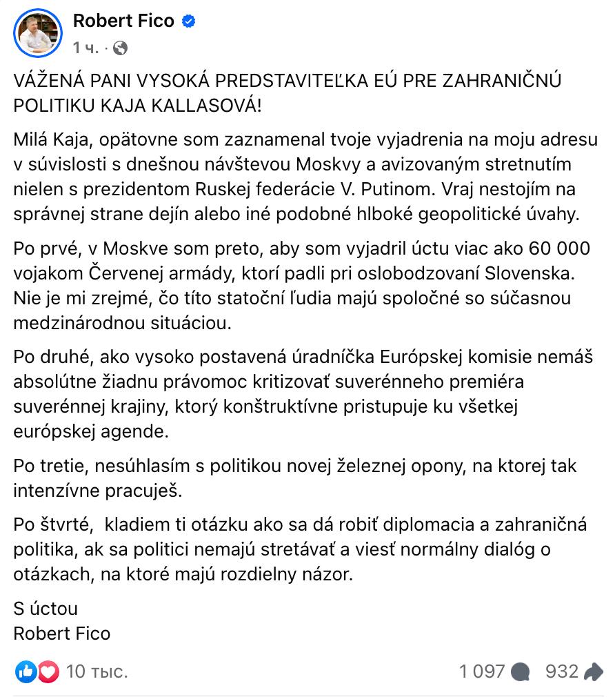 Премьер-министр Словакии Роберт Фицо сделал резкое заявление в адрес верховного представителя Европейского Союза по иностранным делам и политике безопасности Каи Каллас.