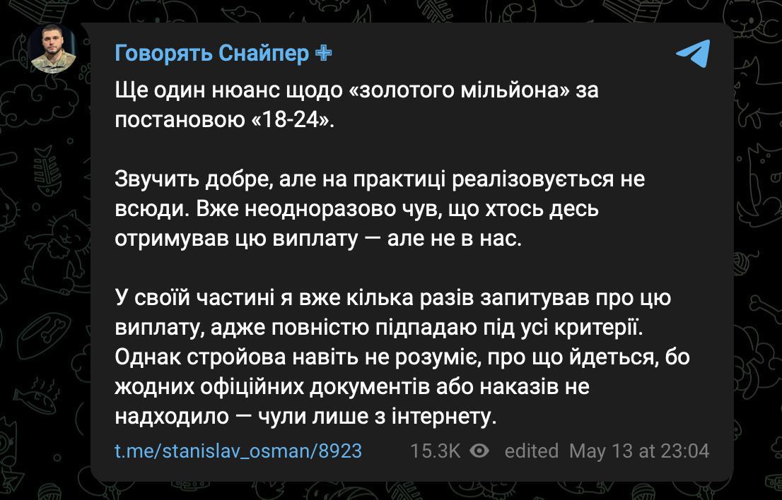"Уже не раз слышал, что кто-то где-то получал эту выплату - но не у нас. В своей части я уже несколько раз спрашивал об этой выплате, ведь полностью подпадаю под все критерии. Однако дежурная по строевой даже не понимает, о чём идёт речь, потому что никаких официальных документов или приказов не поступало - слышали только из интернета", - пишет Бунятов.