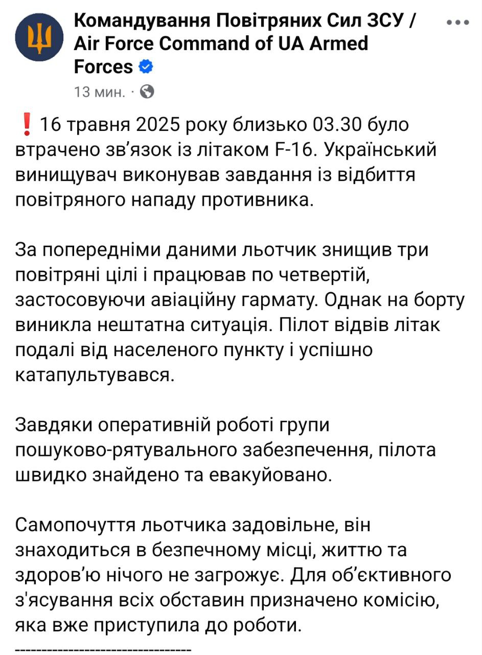 16 мая 2025 года около 03.30 была потеряна связь с самолетом F-16. Украинский истребитель выполнял задачи по отражению воздушного нападения противника.