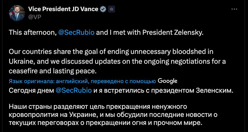 "Наши страны разделяют цель прекращения ненужного кровопролития в Украине, и мы обсудили последние новости о текущих переговорах о прекращении огня и прочном мире", - сообщил Вэнс в соцсети Х.