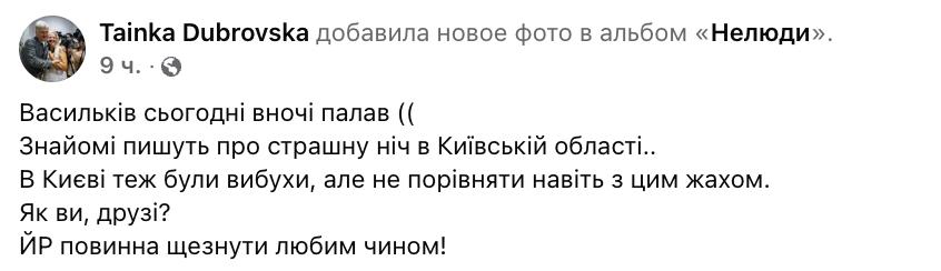 "В Киеве тоже были взрывы, но это даже не сравнить с этим ужасом", - заявила Татьяна Дубровская со ссылкой на своих знакомых из Василькова.