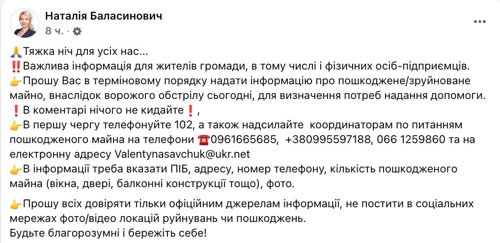 Мэр Василькова Наталья Баласинович назвала ночь "тяжелой для всех нас" и дала жителям города контакты, куда обращаться по поводу поврежденного жилья.