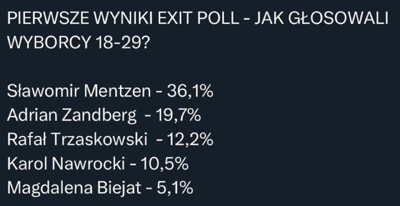 Между тем подсчеты свидетельствуют о том, что молодые поляки 18-29 лет на вчерашних выборах больше всего поддержали антиукраинского кандидата Славомира Менцена. Он набрал в этой возрастной категории 36,1%. На втором месте оказался представитель левой партии "Разом" Адриан Зандберг и только на третьем - победитель первого тура мэр Варшавы Тшасковский.