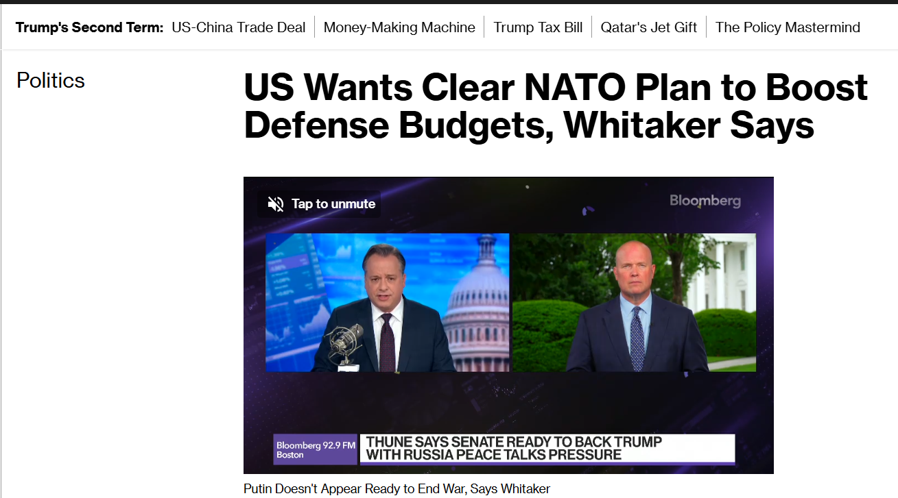 Постоянный представитель США в НАТО Мэттью Уитакер заявил, что Альянсу необходимо представить четкие шаги для достижения целевого показателя расходов на оборону в размере 5% от объема производства с упором на "жесткие оборонные возможности".