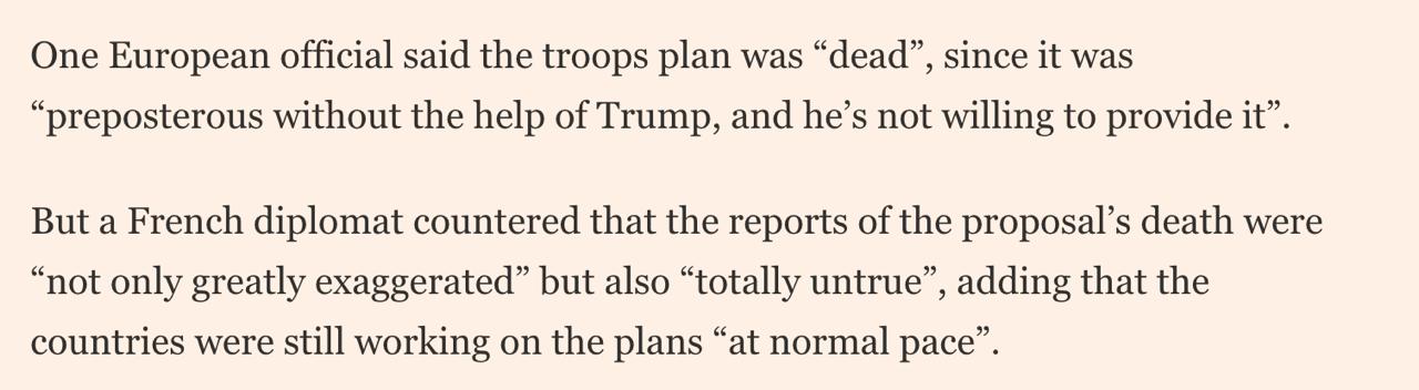 План ввода европейских миротворцев в Украину мертв, поскольку он нелеп без поддержки президента США Дональда Трампа, а тот не готов её предоставить.