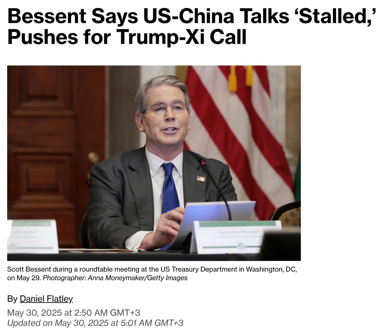 Министр финансов США Скотт Бессент заявил, что торговые переговоры с Китаем "немного зашли в тупик" и что для достижения соглашения нужен разговор президента США Дональда Трампа и главы КНР Си Цзиньпина.