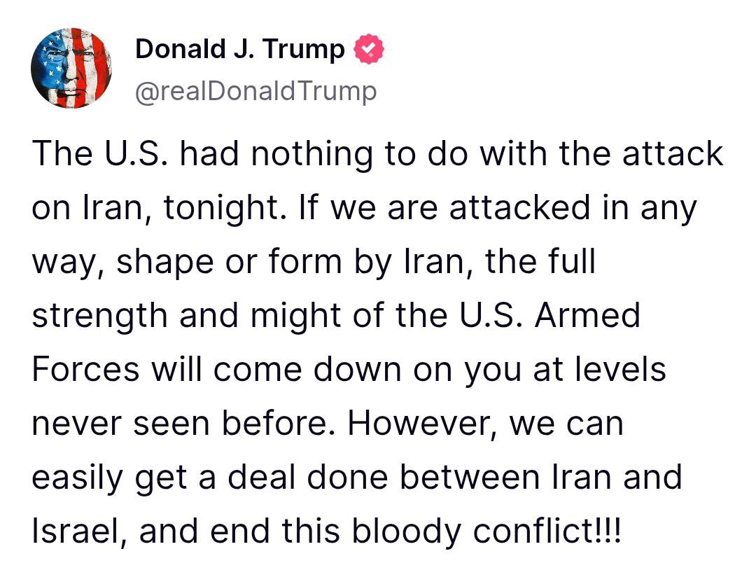 "США не имели никакого отношения к сегодняшнему нападению на Иран. Если Иран каким-либо образом или в какой-либо форме нападет на нас, вся сила и мощь вооруженных сил США обрушатся на вас на уровнях, которых никогда не было. Однако мы можем легко заключить сделку между Ираном и Израилем и положить конец этому кровавому конфликту", - написал президент США в социальной сети Truth Social.